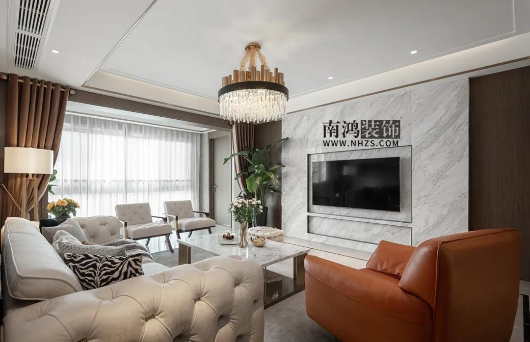 家具用料完美兼容了質樸與奢華的氣質,大理石臺面的茶幾與頂上繁復的吊燈呼應,搭配金屬質感與清新綠植的點綴,營造出優雅端莊的會客環境。