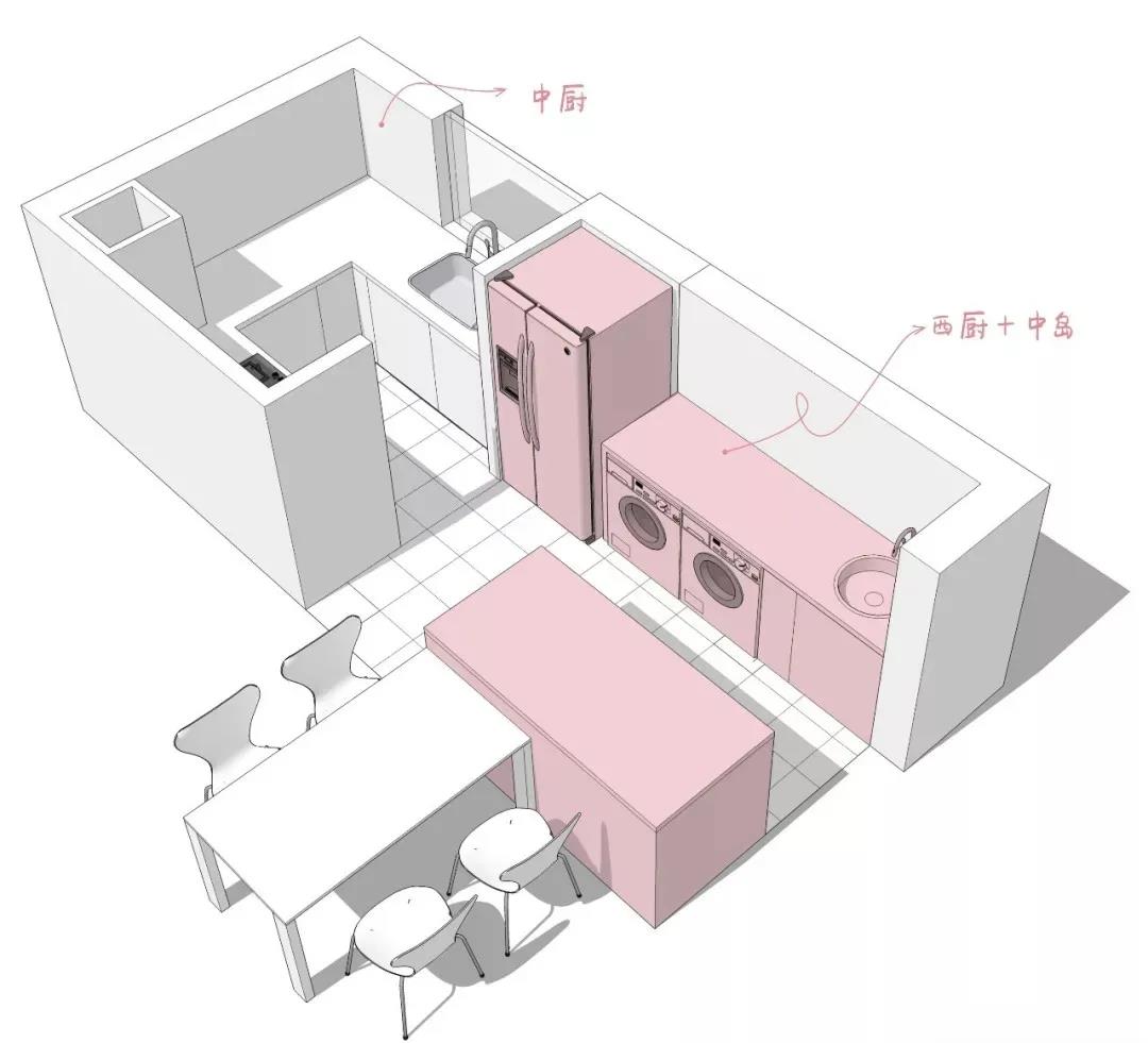 如果你是那種西餐或烘焙的愛好者,想要有更多的操作空間,或者廚房用品特別多而餐廚空間又有盈余的話,不妨再多添入一個中島臺。